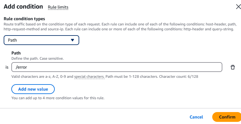 기본 규칙은 모든 요청을 ALB의 대상 그룹으로 보내라는 것이다. Add rule을 눌러 규칙을 추가할 수 있다.