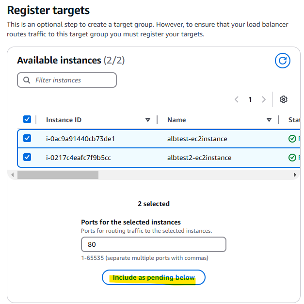 원하는 인스턴스를 선택해 포트 80에 pending상태로 추가하고 대상 그룹을 생성한다.