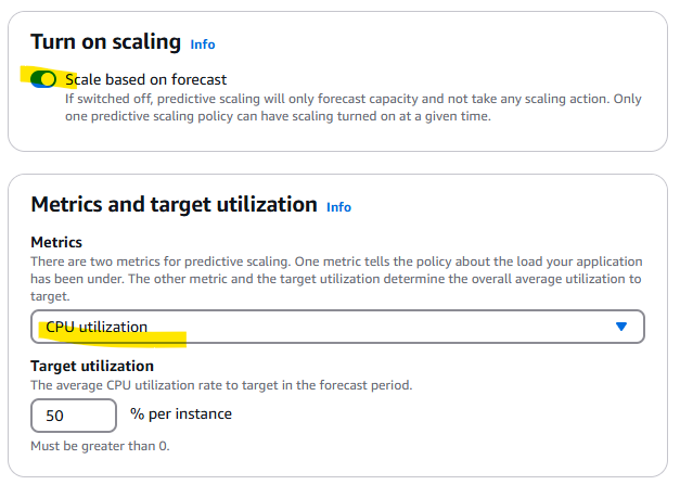과거 부하를 기반으로 예측하는 것에 체크하고 지표를 설정해 인스턴스당 CPU사용률을 설정할 수 있다.