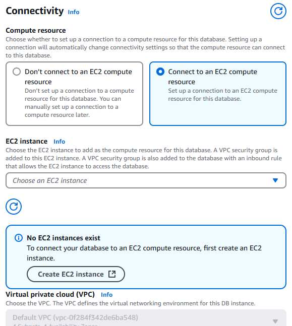 연결성에서 EC2인스턴스와 RDS를 연결할건지 선택할 수 있다.