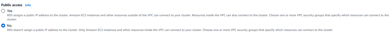 Public Access 설정 시 Yes를 선택하면 EC2인스턴스 말고 외부에서 접근이 가능하다. 그러기 위해 자동으로 AWS로부터 public IP를 부여받기 때문에 과금이 발생할 수 있다!!!