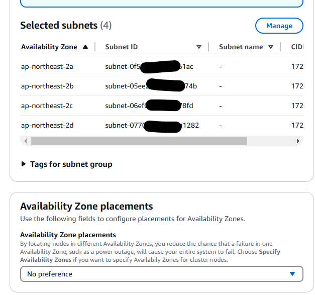 서브넷까지 설정하면 AZ배치에서 각 AZ에 어떤 복제본이 배치될지 지정할 수 있다. 지금은 다중AZ를 비활성화 했기 때문에 그냥 넘어간다.