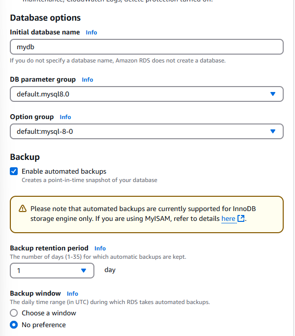 추가적인 설정에서 초기 DB이름을 입력할 수 있고 백업을 활성화/비활성화할 수 있다. 활성화하면 1~35일 동안 백업파일이 보관된다.