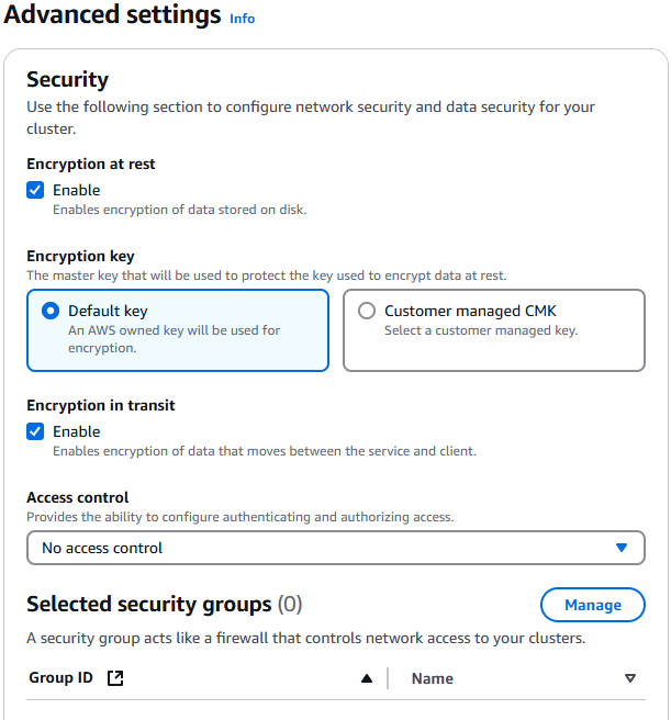 전송 중 데이터 암호화도 활성화 할 수 있고, 활성화 하면 엑세스 제어기능이 제공된다. 캐시에 엑세스 할 수 있는 것으로 토큰이나 사용자 그룹 중 선택하면 된다.(여기선 비활성화)
