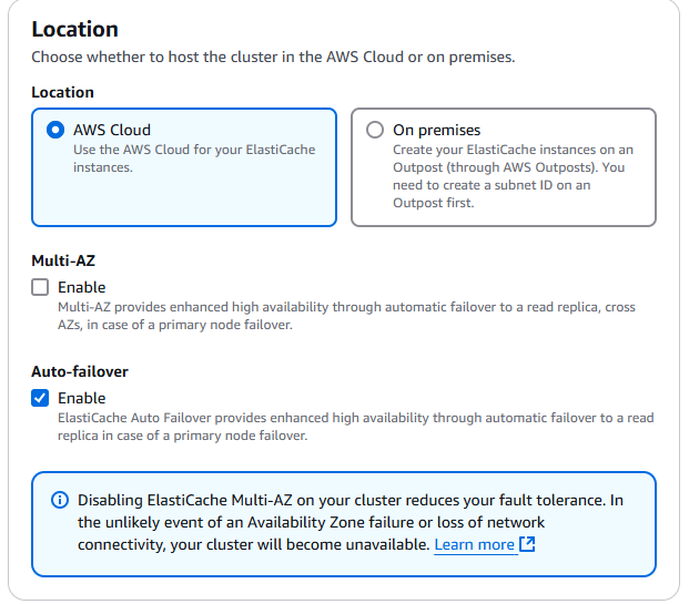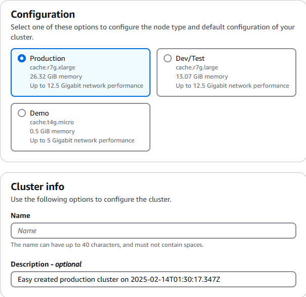 생성 옵션으로 간편한 생성 / 클러스터 캐시(직접 모든 설정)/ 백업에서 복원 중 선택하여 ElastiCache를 만들 수 있다.