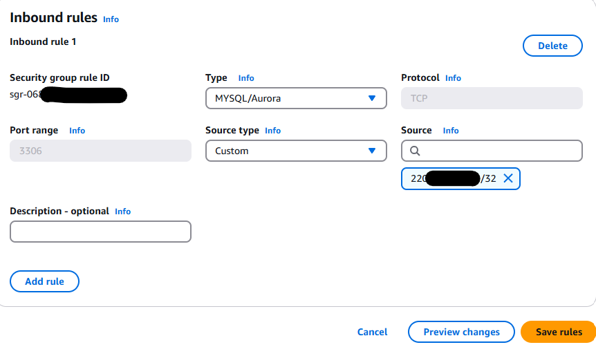 보안그룹의 인바운드 규칙에서 3306포트의 소스를 현재는 나의 IP만 되는데 이를 누구나로 수정해준다.