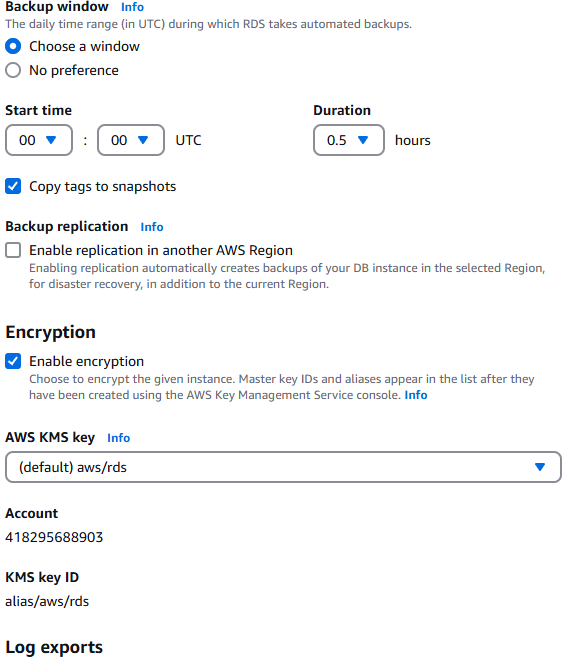 저장 데이터 암호화를 원하는지 선택하고, 선택했다면 키를 지정해야 한다.