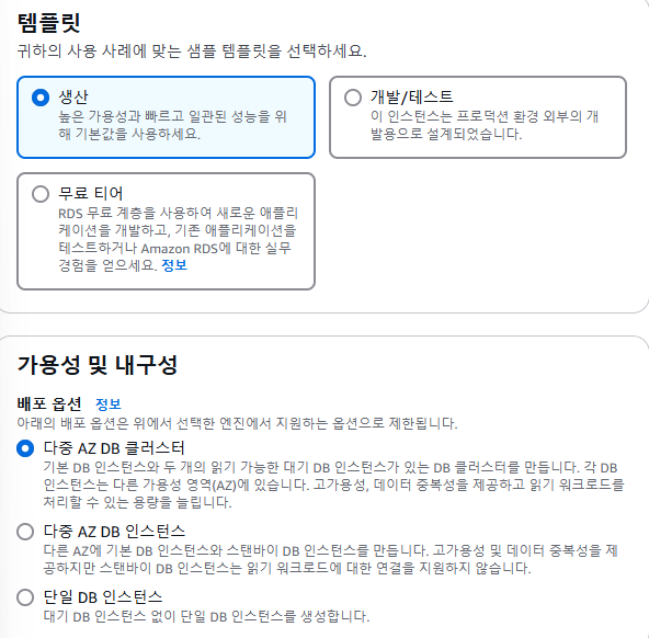 가용성과 내구성에서 다중AZ 여부를 선택한다.