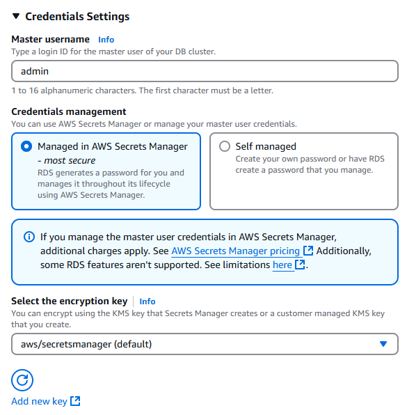 자격증명에서 AWS Secret Manager를 선택하면 추가요금이 부과된다.