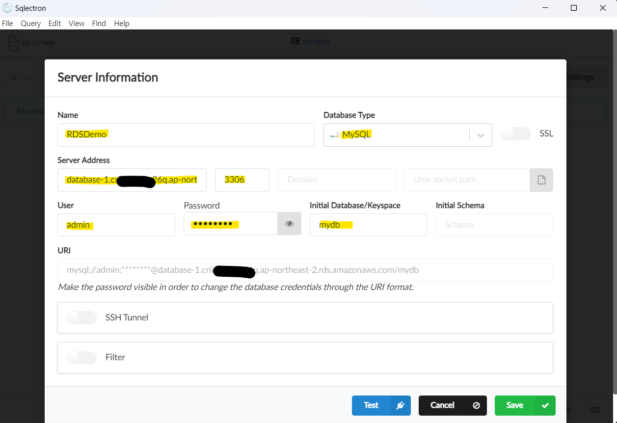 DB이름과 타입, 서버 주소는 RDS의 Endpoint를 복사해서 붙여넣고 포트도 RDS의 3306포트로 설정한다. User는 RDS생성 당시의 관리자 이름을 넣어주고 패스워드를 입력한다. initial Database는 RDS에서 설정한 이름으로 하고 TEST를 누른다.