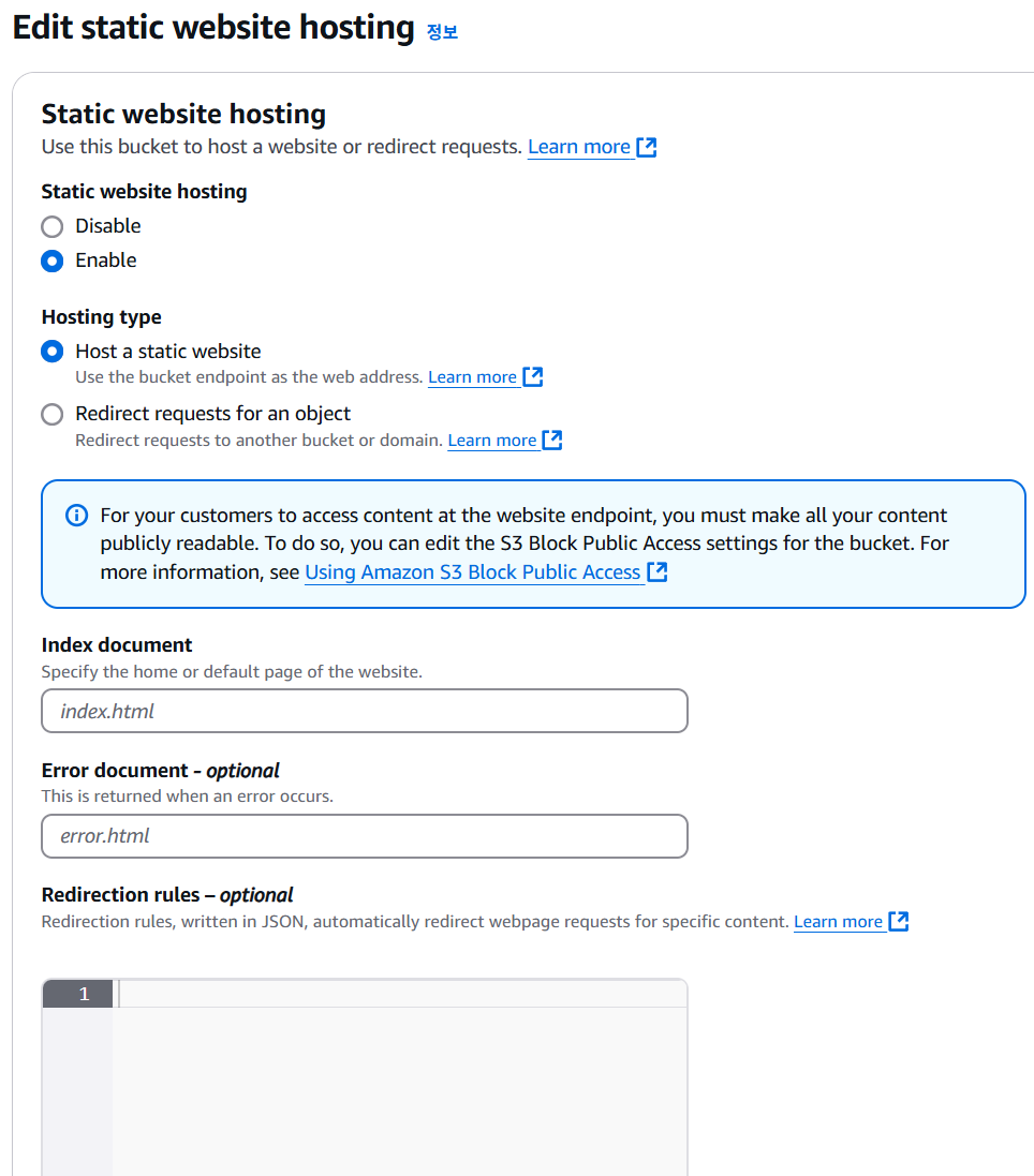 인덱스는 index.html로 입력한다. 이 파일이 버킷에 있어야 하며 이는 웹 사이트의 기본 페이지이다.