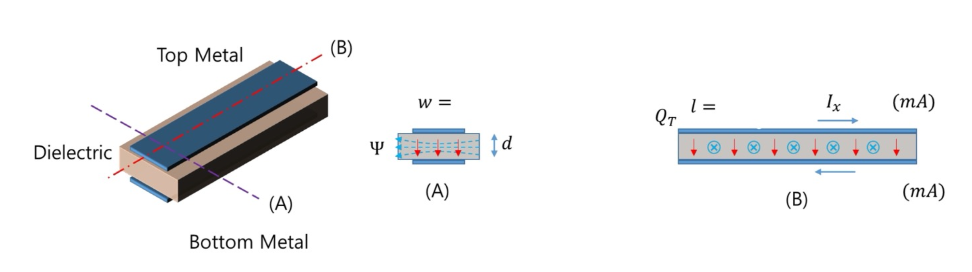 위의 이미지는 어떤 PCB 기판이다. Top metal과 Bottom metal 사이에 유전체가 포함되어 있다. 10 mA의 전류가 이상적으로 uniform하게 흐르고 있고 top과 Bottom 사이에 1 V가 흐르고 있다고 가정한다.