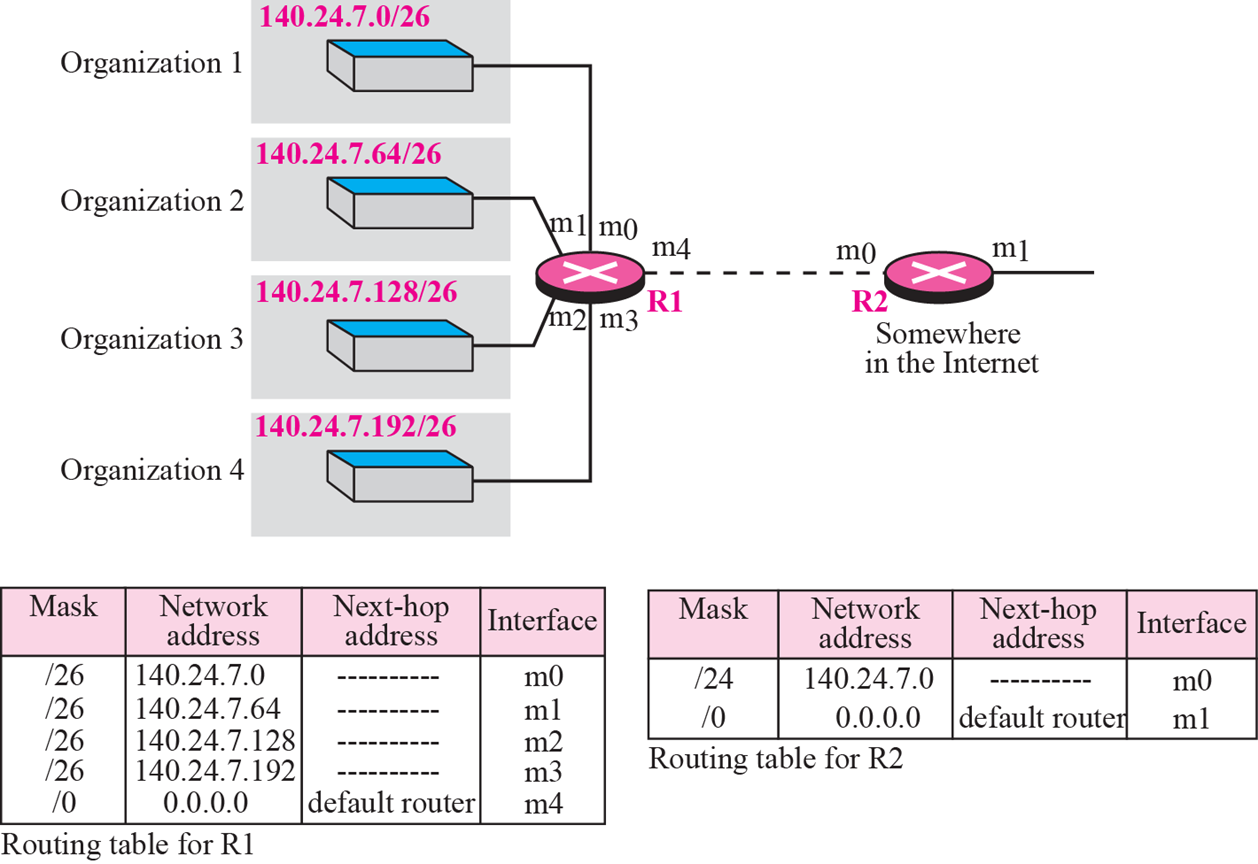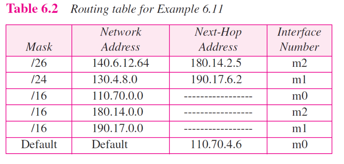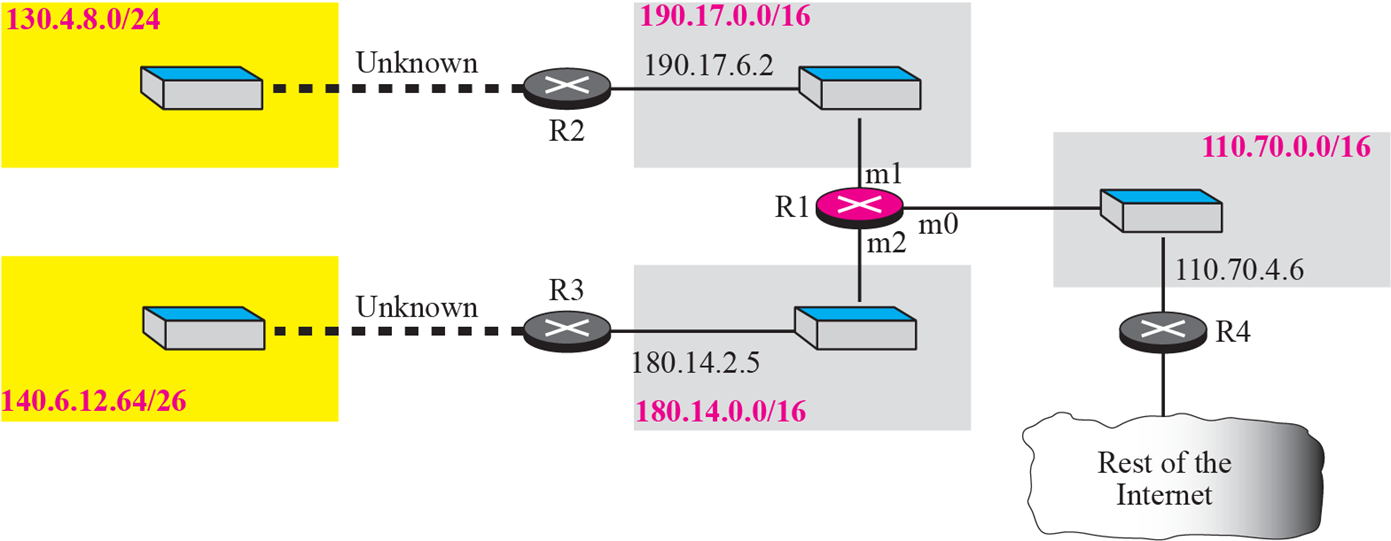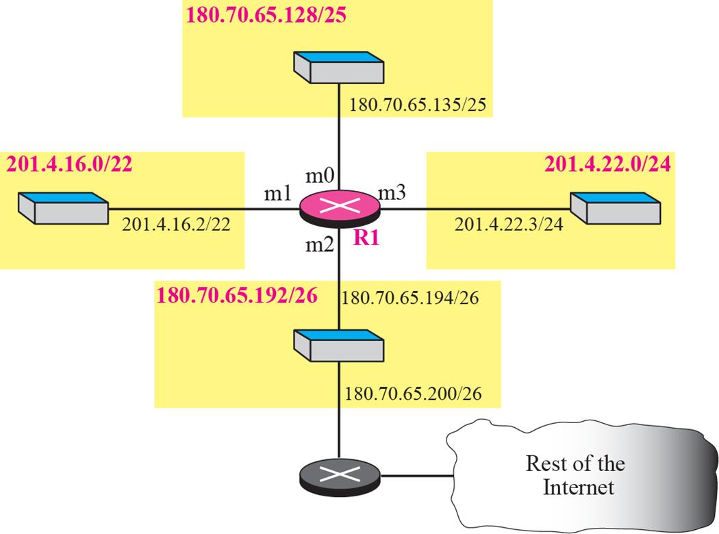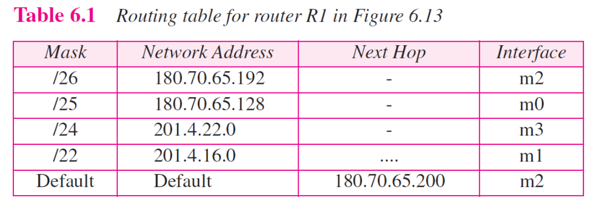 Router R1 in Figure 6.8 receives a packet with destination addres 167.24.160.5. Show how the packet is forwarded.