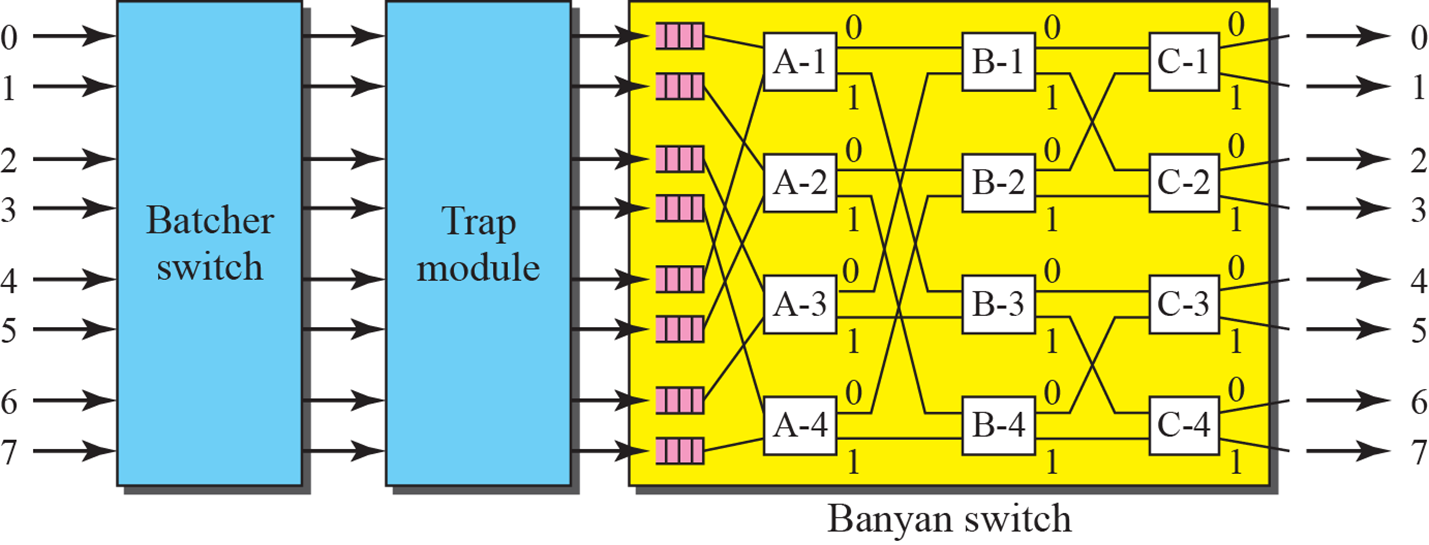 Batcher switch: 내부 블로킹이 일어나지 않도록 패킷을 정렬Trap module: 같은 목적지로 가지 않도록 조정-> 블로킹 확률을 줄일 수 있다