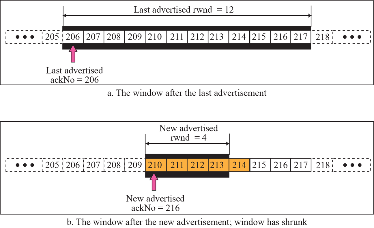 - shrink되면 ACK를 받지 못한 214가 window 밖으로 나가게 됨
