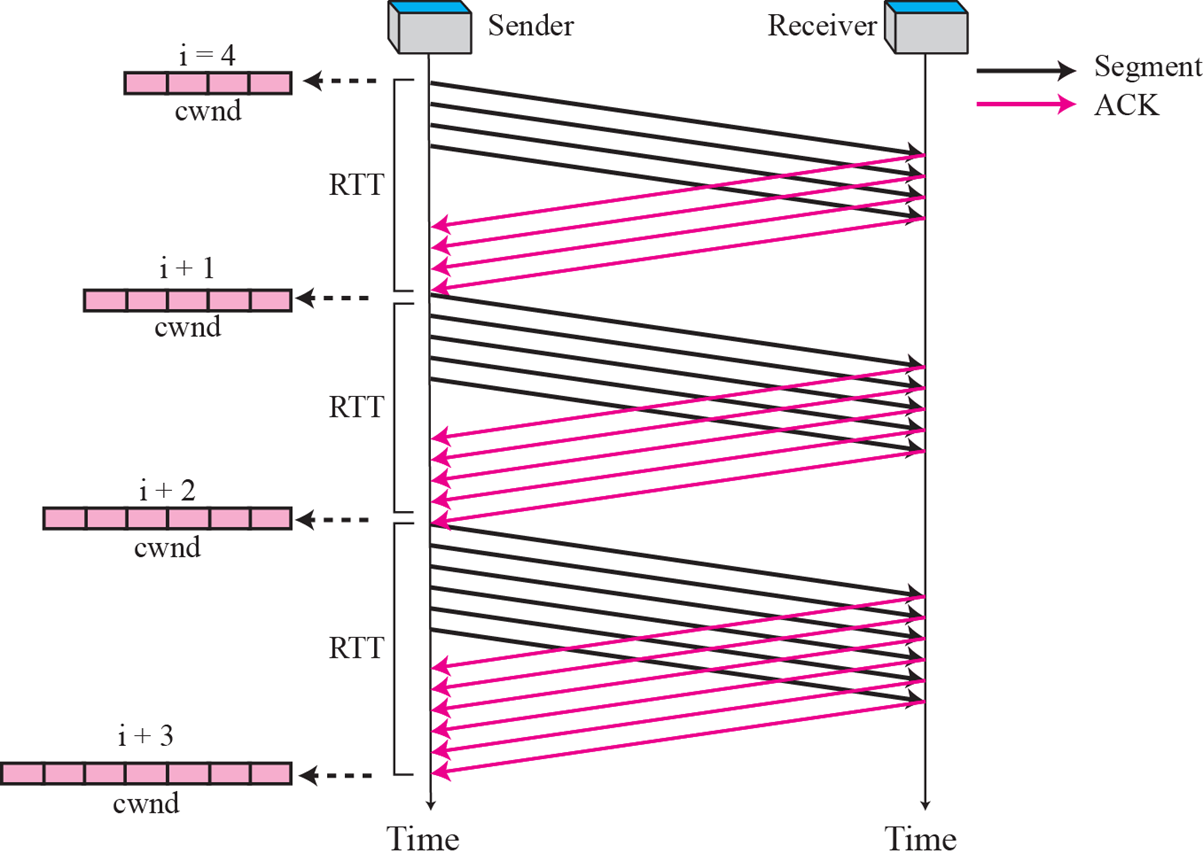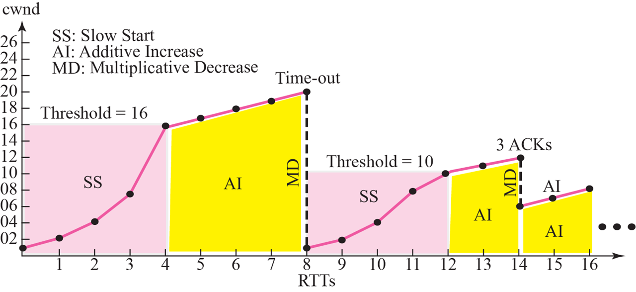 - Congestion이 감지된 시점을 기준으로 cwnd를 반으로 줄여 Additive Increase