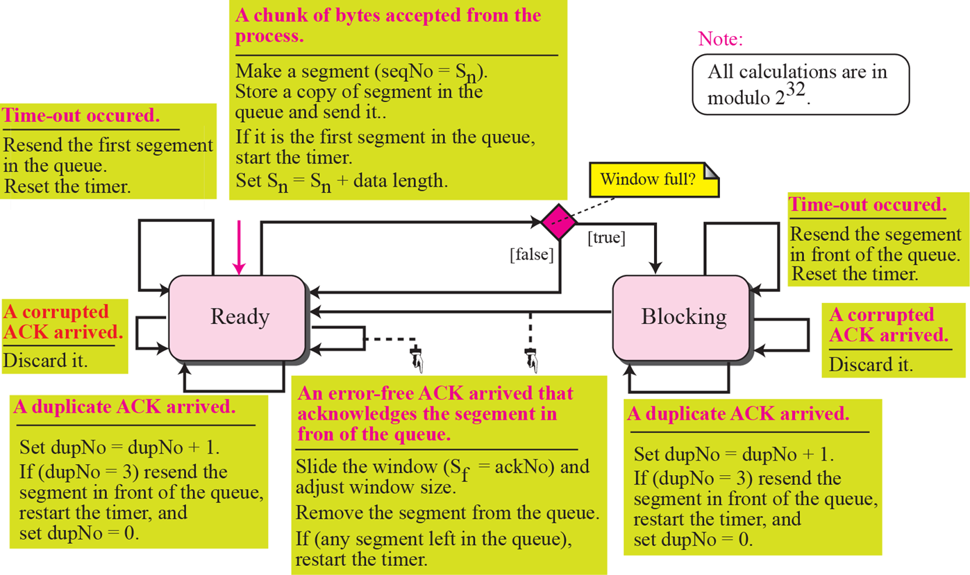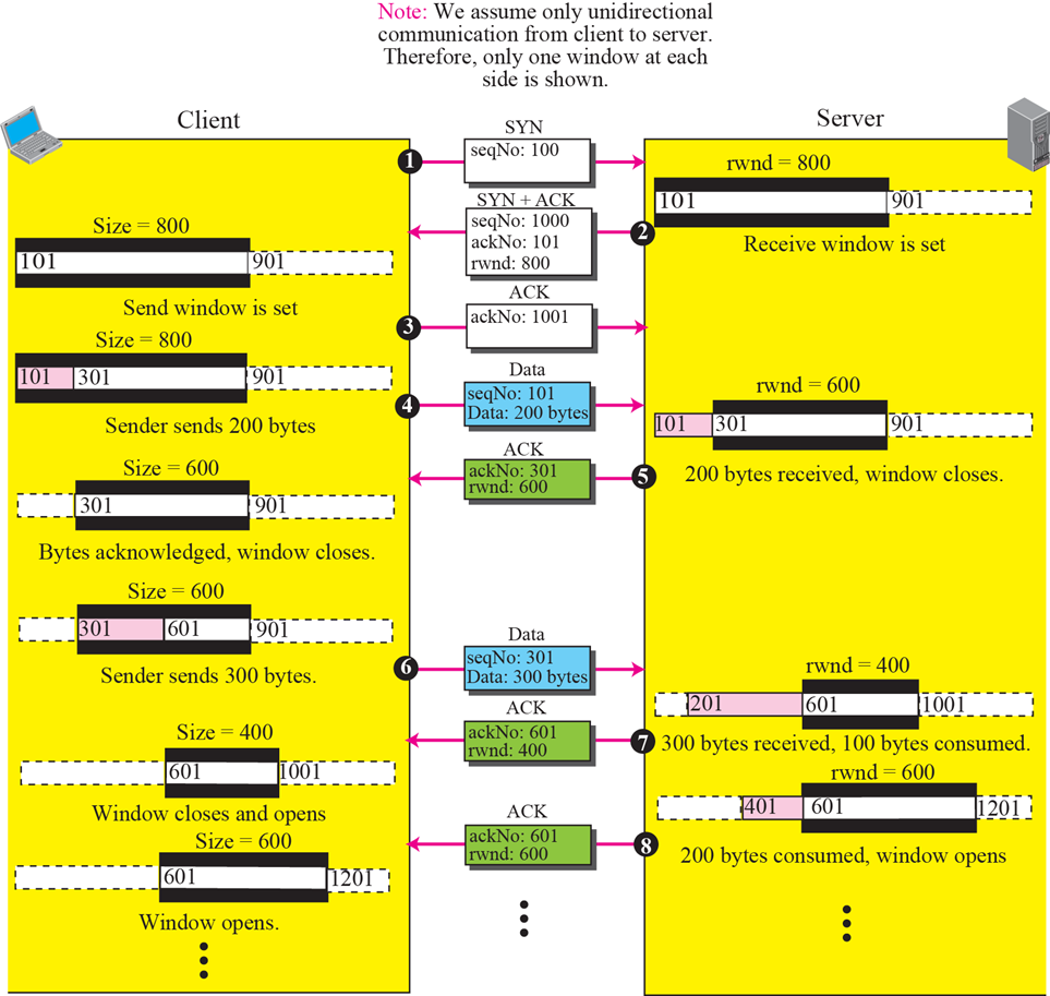 - Go-Back-N이나 Selective reqeat는 오른쪽 벽과 왼쪽 벽이 함께 움직였지만 TCP는 따로 움직이며 Window size를 조정한다.
