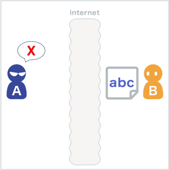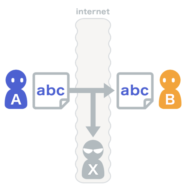 A가 B에게 메세지를 전송할 때 경로상에 있는 X가 메세지 내용을 훔쳐볼 가능성이 있다.