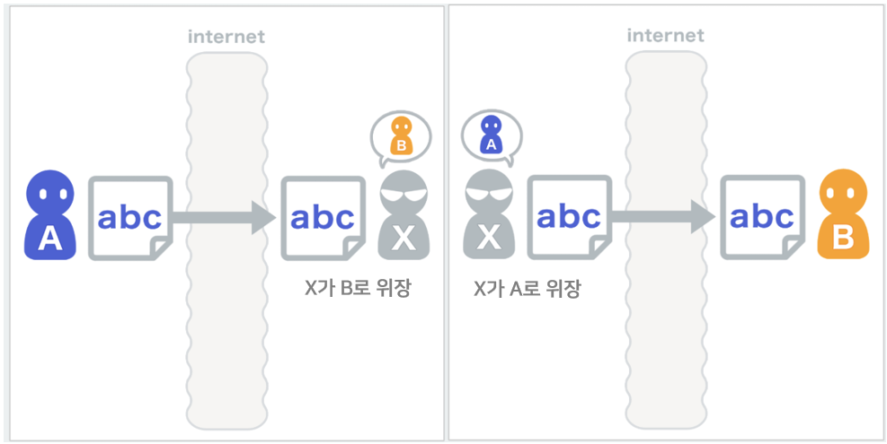 A가 B에게 메세지를 전달했다고 생각하지만, X가 B로 위장했을 가능성이 있다.