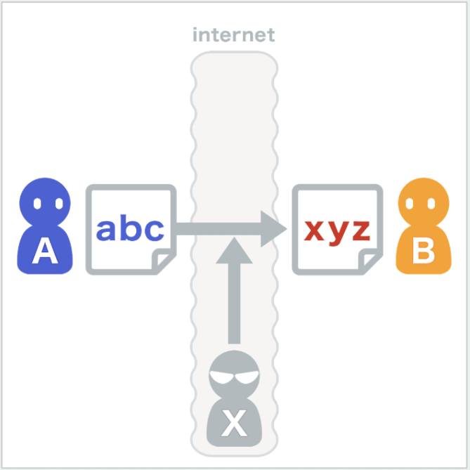 A가 B에게 메세지 전송을 확실하게 완료해도 도중에 X가 메세지 내용을 변경했을 가능성이 있다.