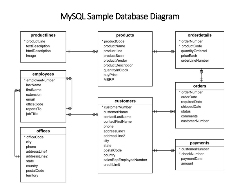 classicmodels 테이블 구조 파악 데이터 구조를 쉽게 파악할 수 있도록 데이터 설계 시 ERD(Entity Relational Diagram)를 작성한다.