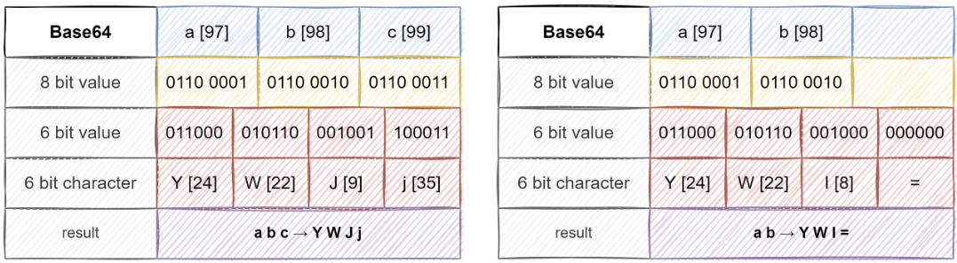 6bit 4개로 바꿨을 때 비는 부분은 0으로 채우고 000000이면 패딩 문자 = 를 넣습니다.