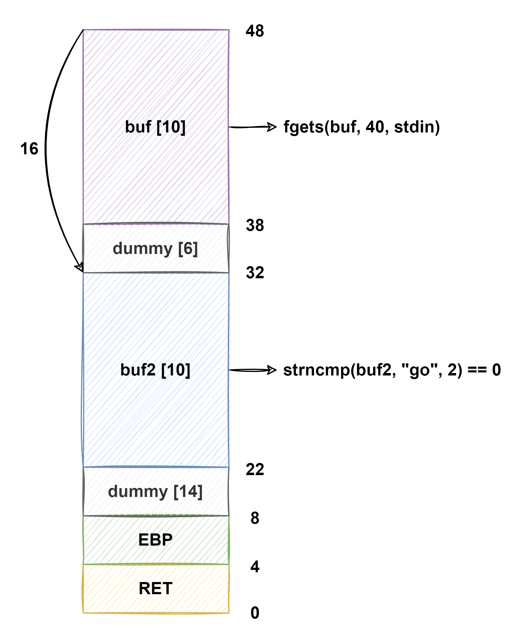0x08048465 <main+69>: call 0x8048330 <strncmp> // strncmp(buf2, "go", 2)