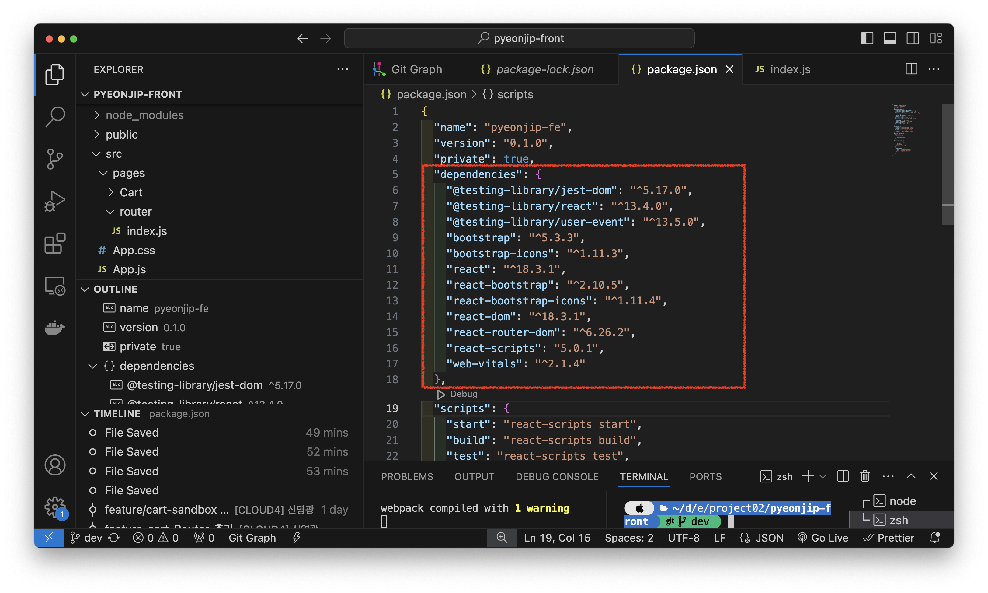 그렇다면 개인이 다운받은 모듈을 모든 팀원들에게 다운 받아주세요~ 라고 공지를 띄워야하나? 그건 뭔가 번거롭고 수동적인 방식 같았다. 검색 결과, 리액트는 package.json 이라고 하는 파일에서 의존 관리를 하고 있었다.