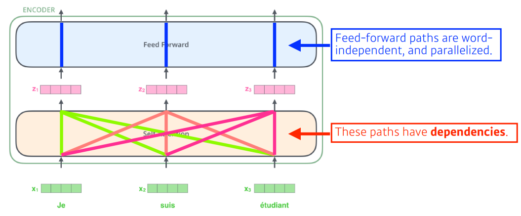 z1을 구하는데에 x1 뿐만 아닌 모든 단어를 고려한다.