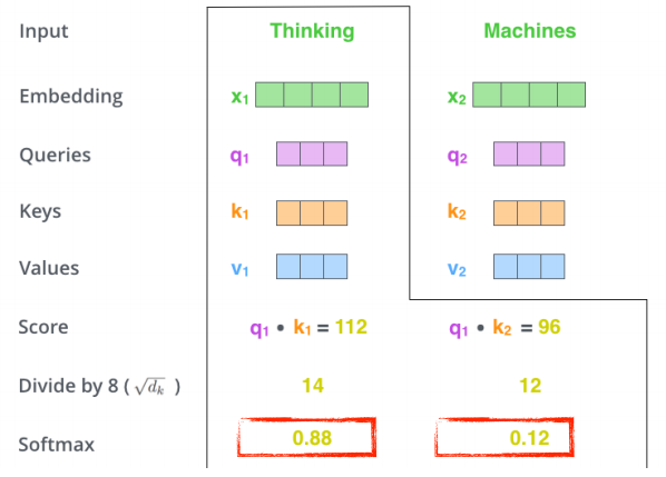 encoding을 하고자하는 단어의 queries vector와, 나머지 모든 n개에 대한 key vector를 구해 내적을 수행해 Score vector를 만든다. 이를 이용하면 단어마다의 interaction을 구할 수 있다.