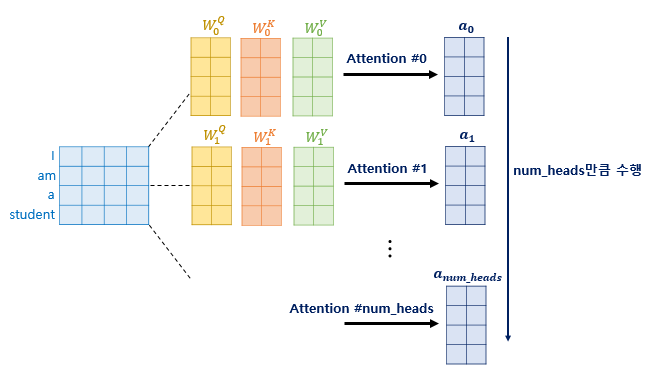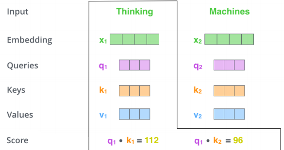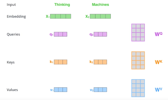 하나의 단어마다, 각각의 neural network를 이용해 queries, keys, values 세 개의 vector를 만들게 된다.