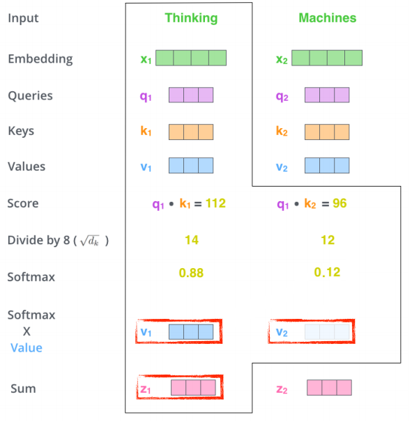 그 후 value vector와 가중합(weigthed sum)을 수행한 후 합한 값이 self-Attention을 이용한 encoding vector가 된다.