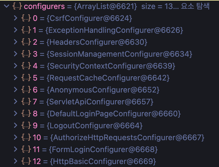 즉, HttpSecurity가 다수의 SecurityConfigurer를 활용하여 SecurityFilterChain을 만드는 구조로 파악할 수 있습니다.