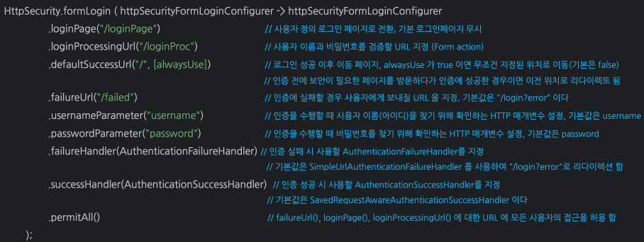 AuthenticationEntryPoint를 통해 인증을 시작하기 위해 사용자를 로그인 페이지로 리다이렉트formLogin() 커스터 마이징formLogin()에서 인증 성공/실패 시의 동작을 유연하게 설정 가능