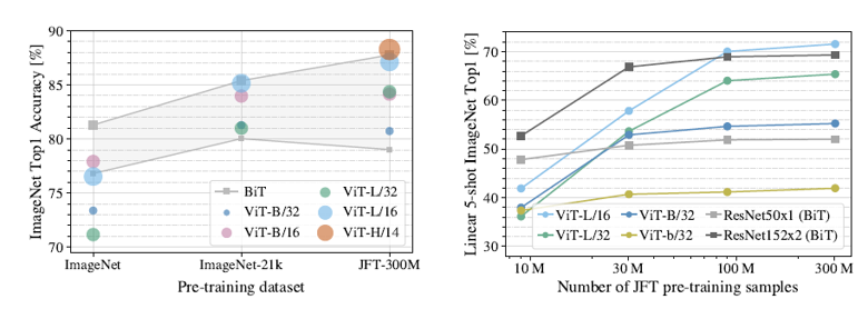 - ViT 계열은 ResNets 계열과 달리 모델이 커짐에도 불구하고 성능 포화 없이 지속적으로 성능이 증가함