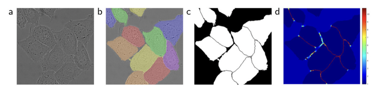 a처럼 cell이 인접해있으면 각 cell과 배경을 구분하는 것은 쉽지만, ****cell 각각을 서로 구분하는 것(논문에서는 instance segmentation이라 표현함)은 어려움. 논문에서는 각 instance의 테두리와 테두리 사이가 반드시 배경이 되도록 처리함. 즉, 2개의 셀이 붙어있는 경우라고 하더라도 그 둘 사이에는 반드시 배경으로 인식되어야 할 틈을 만들겠다 라는 의미 (d에서 확인 가능)
