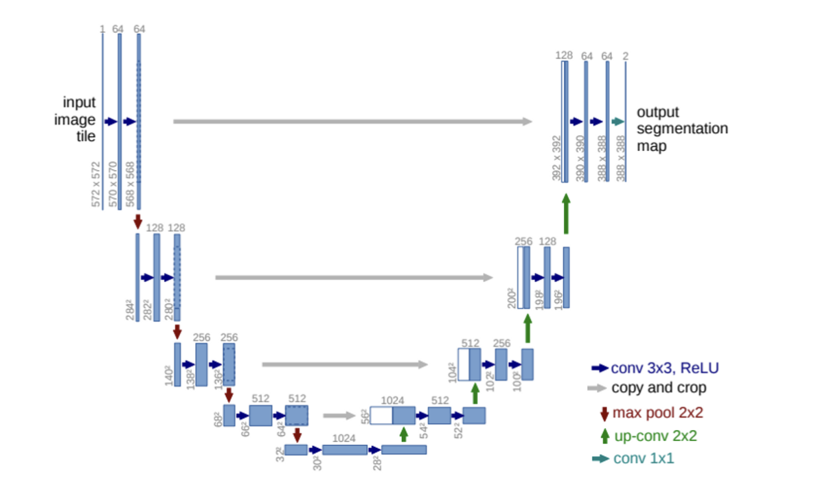 그림에서 세로 방향 숫자는 맵(map)의 차원을 표시하고 가로 방향 숫자는 채널 수를 표시한다. 예를 들면 세로 방향 숫자 256x256 과 가로 방향 숫자 128 은 해당 레이어의 이미지가 256x256x128 임을 의미한다. 입력 이미지는 512x512x3 이므로 RGB 3개 채널을 갖고 크기가 512x512 인 이미지를 나타낸다.