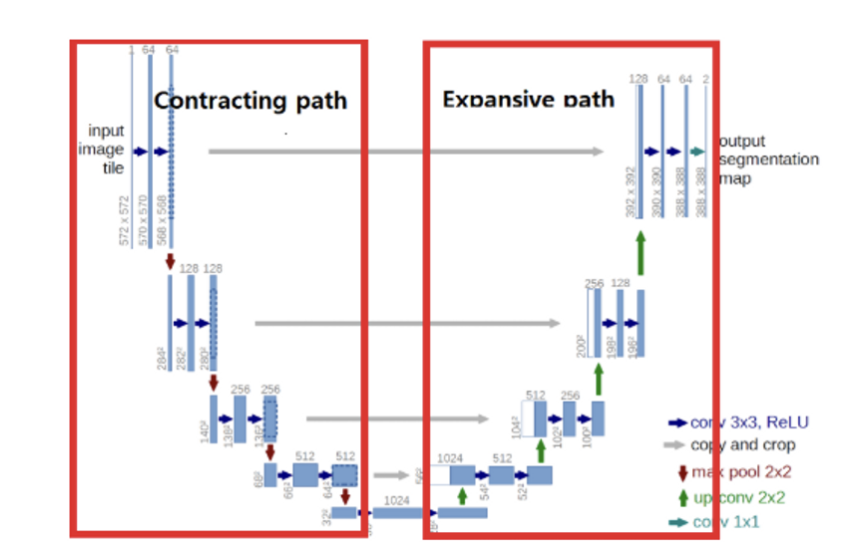Contracting Path는 일반적인 CNN을 따르며,downsampling을 위한 Stride2, 2x2 max pooling 연산과 ReLU를 포함한 두 번의 반복된 3x3 unpadded convolutions 연산을 거친다.