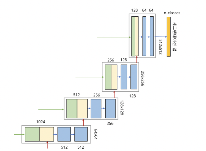 그림에서 파란색 박스 2개는 인코더에 있는 ConvBlock와 동일하다. 녹색 박스는 스킵 연결을 통해서 인코더에 있는 맵을 복사한 것이다. 노란색 박스는 디코더의 하위 단계에서 전치 컨볼루션(transposed convolution)을 통해서 맵의 차원을 두배로 늘리면서 채널 수를 반으로 줄인 것이다. 두 개의 맵을 서로 합쳐서(concatenation) 저차원 이미지 정보뿐만 아니라 고차원 정보도 이용할 수 있는 것이다. 디코더의 그림에서도 회색 박스가 반복적으로 나타나므로 한 개의 레이어 블록으로 구현하여 사용하면 편리하다. 이 블록 이름을 DecoderBlock 이라고 하자.