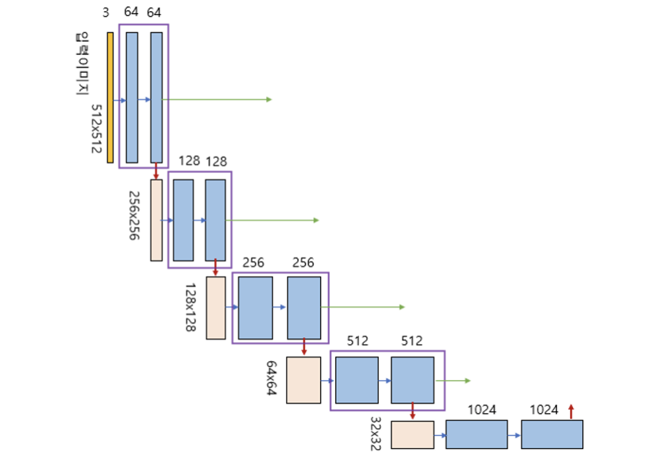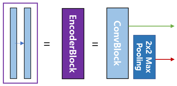 인코더 그림을 보면 보라색 박스안에 한 개의 ConvBlock이 있고 이 박스가 인코더의 각 단계마다 나타나는 것을 볼 수 있다. 이 박스에서 나오는 출력이 2개인데, 한 개의 출력은 U-Net의 디코더로 복사하기 위한 연결선이며, 또 한 개의 출력은 2x2 max pooling 으로 다운 샘플링(down sampling)하여 인코더의 다음 단계로 내보내는 빨간색 화살선이다. 이 박스도 한 개의 레이어 블록으로 구현하여 사용하면 편리하다. 이 블록 이름은 EncoderBlock.