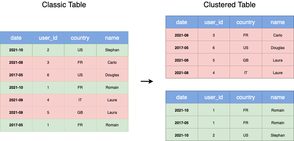 - 파티셔닝된 테이블에는 클러스터링 할 수 x