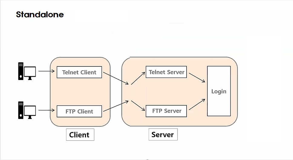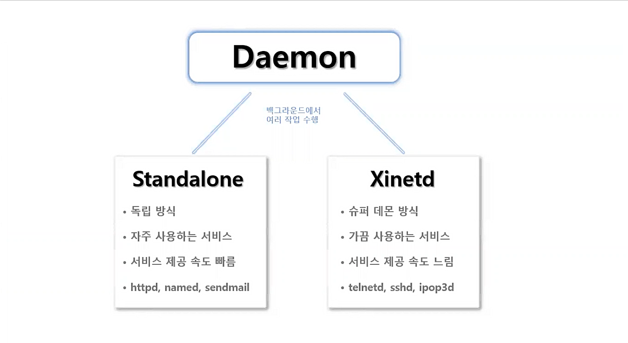 xinetd 자체는 standalone 방식으로 작동되지만 다른 데몬이 필요할때마다 불러 실행시킨다. 요청이 들어오면 xinetd가 다시 요청 해줘야된다.