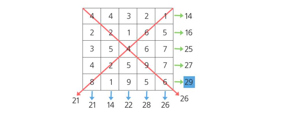 각 행의 합은 integer 범위를 넘어가지 않는다.