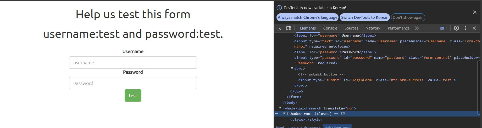 위의 말을 참고하여 username과 password를 test로 입력해보았다.