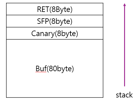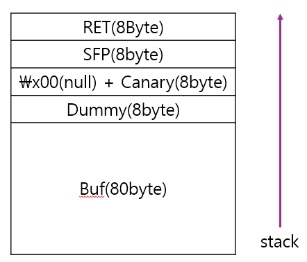 따라서 88(96-8)byte가 카나리 값이 위치한 곳이다. 또한 buf, canary까지 크기가 buf~rbp크기(offset)에 비해 작기 때문에 8byte 크기의 dummy값(쓰레기값)이 존재한다는 사실을 알 수 있다.