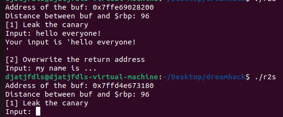 buf주소가 바이너리를 실행할 때마다 바뀌는 것과, buf~rbp는 96byte임을 확인할 수 있다.