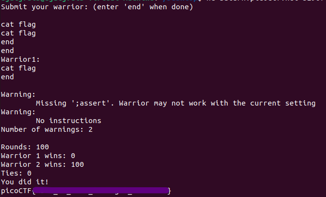 다시 들어가서 커맨드 명령어가 먹히는지 확인하기 위해 'cat flag'라고 입력하고 'end'를 입력해보았다.