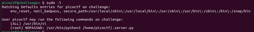 picoctf라는 사용자가 challenge 호스트에서 실행할 수 있는 sudo 권한을 나타내고 있다.