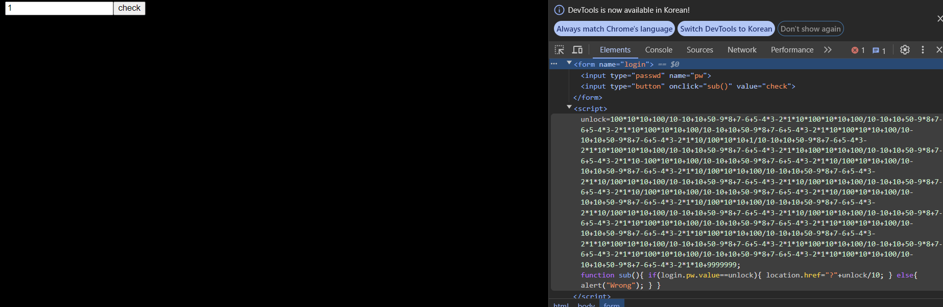 function sub(){ if(login.pw.value==unlock){ location.href="?"+unlock/10; } else{ alert("Wrong"); } }