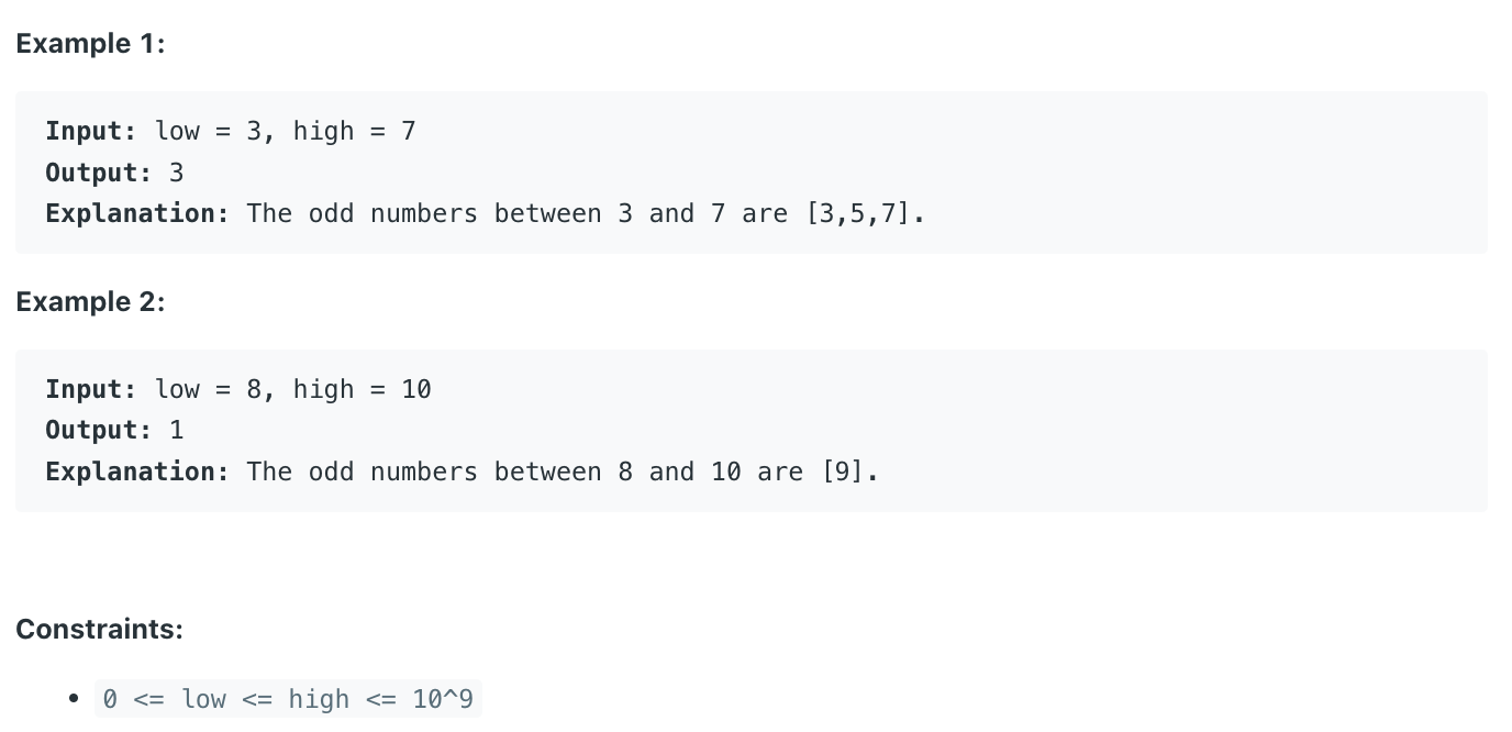Given two non-negative integers low and high. Return the count of odd numbers between low and high (inclusive).
